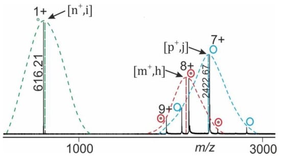 NanoESI mass spectrum of gas phase dissociation of protein complex (e.g., holo-myoglobin; apo-myoglobin—heme complex). Gaussian fits of ion intensities of the related charge state series for each molecular or supra-molecular species (complex) are shown (dashed charge state envelope curves). The arrows point to apices which are determined as maxima of fitted curves. The vertical dashed lines provide heights of charge structure envelopes which represent relative intensities of holo-protein complex ions (h, educts; red), ligand ions (i, product; green), and apo-protein ions (j, product; blue). Locations on the m/z axis match with mean charge states of holo-protein complex ions (, educts), ligand ions (, product) as well as apo-protein ions (, product).
