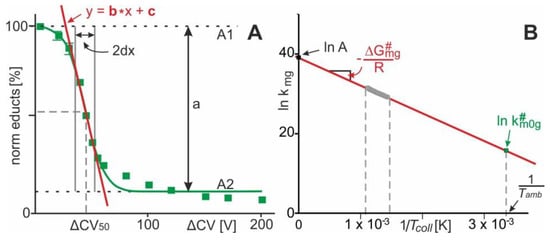 A series of mass spectra in which the collision cell voltage difference is increased stepwise records ion signals with varying intensities of all ion species, i.e., educts and products, as they emerge from the collision induced complex dissociation reaction. Plotting the normalized intensities of the educts of the complex dissociation reaction in the gas phase as a function of collision cell voltage difference () provides a sigmoidal shaped curve with Boltzmann characteristics (Figure 3A). The “steep part” of the dissociation reaction dependence (interval 2dx), i.e., the “energy regime” with greatest dependence between educt ion intensities and , as well as the determination of from the Boltzmann fit to the data points is inferred by mathematical procedures which lead to the equation of the tangent line (see supplemental information for calculations).