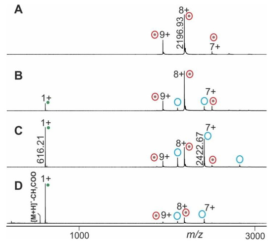 Nano-ESI mass spectra from myoglobin dissociation experiments. Different collision cell voltage differences () are shown. (A) 4 V. (B) 30 V. (C) 60 V. (D) 120 V. Charge states and m/z values for selected ion signals are given for holo-myoglobin ions (red circles with dots on right ion series), apo-myoglobin ions (blue circles without dots on right ion series) and for the released heme ions (green dots on left ion series). Solvent: 200 mM ammonium acetate, pH 7.