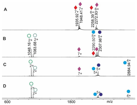 Nano-ESI mass spectra from RNAse S dissociation experiments. Different collision cell voltage differences () are shown. (A) 3 V. (B) 17 V. (C) 30 V. (D) 50 V. Charge states and m/z values for selected ion signals are given for RNAse S ions (red/purple diamonds on right ion series), S-protein ions (light blue/dark blue filled circles on right ion series) and for the released S-peptide ions (light green/dark green circles on left ion series). Solvent: 200 mM ammonium acetate, pH 7.