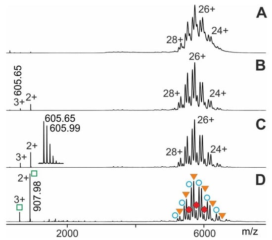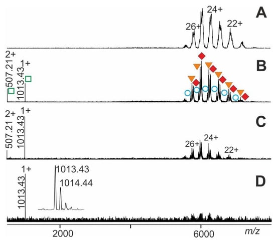 Nano-ESI mass spectra of Tn I-peptide—antiTn I antibody complex dissociation. Different collision cell voltage differences () are shown. (A) 4 V. (B) 16 V. (C) 30 V. (D) 80 V. Charge states and m/z values for selected ion signals are given for the immune complexes (antibody plus one Tn I-peptide and antibody plus two Tn I-peptides; filled orange triangles and filled red diamonds, respectively; right ion series), antiTn I antibody (open blue circles; right ion series), and Tn I-peptide (open green squares; left ion series). Insert shows a zoom of the triply-charged Troponin I epitope peptide ion signal. Solvent: 200 mM ammonium acetate, pH 7.