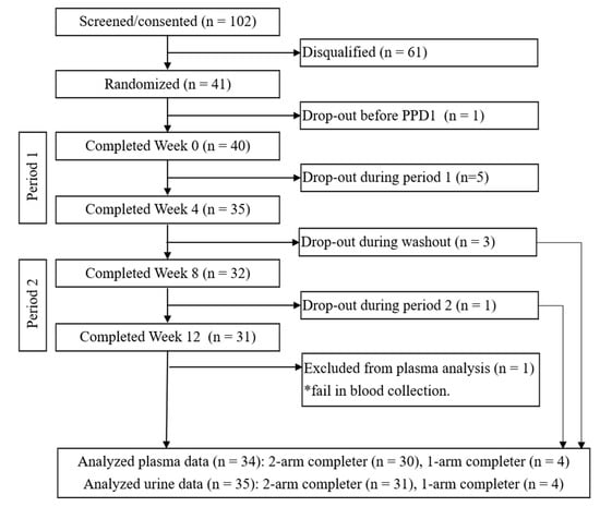 During the supplementation periods, ASA24 was completed by subjects once per week to record all food and drink consumed in the past 24 h. The total calorie, fat, protein, carbohydrate, sugar, fiber, vegetable amount, and fruit amount were calculated based on the ASA24 reports and analyzed with SAS 9.4 (SAS Institute, Inc., Cary, NC, USA). Background diets did not change significantly during the study periods (Table S3).