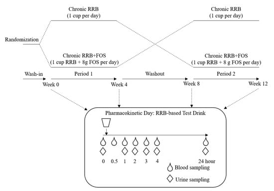 This study was a randomized, single-blinded, two-arm, 4-week, within subject crossover design incorporating the multi-sampling RRB-based test drink (RRBtest) protocol to assess RRB (poly)phenolic metabolism before and after supplementing the diet for 4 weeks with RRB and RRB+FOS (Figure 1 and Figure 2). Subjects were randomly assigned a supplementation order (RRB → RRB+FOS or RRB+FOS → RRB) separated by a 4-week washout period. Subjects were involved actively in the study for ~14 weeks from screening to completion. During each supplementation period, subjects came to the CNRC weekly to pick up standardized pre-made frozen drinks for daily consumption. At the end of each 4-week period, subjects participated in a “Pharmacokinetic Day (PKD)” visit following an identical protocol as baseline (week 0). Briefly, at each PKD, subjects consumed a RRBtest drink to access the PK profile of RRB (poly)phenols and their metabolites over 24 h. PK profiles after 4-week RRB or RRB+FOS supplementation were compared to baseline data. Each PKD lasted approximately 4.5 h with blood samples collected at 0, 1, 2, 3 and 4 h, urine sample collected at 0, 1, 2, 3 and 4 h, and then a final blood and urine sample the next morning (24 ± 1 h) calculated from the time of the RRBtest drink the day prior.