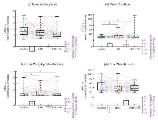 Urinary (poly)phenolic metabolites AUC0–24h (areas under the 24-h curve) post-consumption of RRBtest drink at the baseline/week 0, after 4-week RRB and 4-week RRB+FOS supplementations: (a) total anthocyanin derivatives; (b) total urolithin derivatives; (c) total phenyl-γ-valerolactone derivatives; (d) total phenolic acid derivatives. * Significant supplementation effect, p < 0.05. The box and whisker plots illustrate the distribution of values for each study visit. The line in the middle of the box is plotted at the median, the inferior and superior limit of the box correspond to the 25th and the 75th percentiles, respectively. Bars represent mean change of AUC0–24h at baseline vs. 4-week RRB and 4-week RRB vs. 4-week RRB+FOS, with their standard errors.