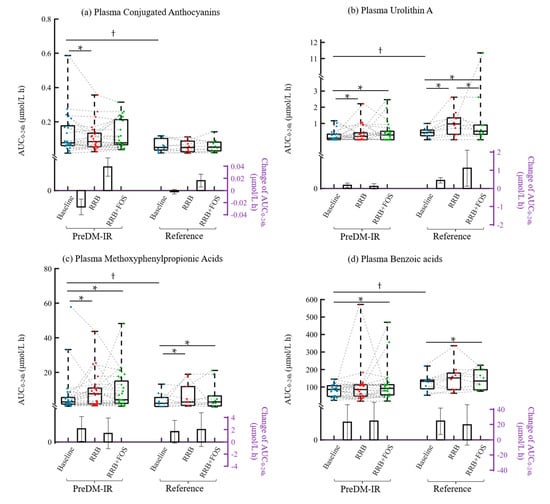 Effect of 4-week RRB and RRB+FOS supplementations on the (poly)phenolic metabolites between PreDM-IR and Reference groups: (a) plasma conjugated anthocyanins; (b) plasma urolithin A derivatives; (c) plasma methoxyphenylpropionic acid derivatives; and (d) plasma benzoic acid derivatives. † Significant Group difference at the baseline, p < 0.05; * Significant supplementation effect within a group, p <0.05. The box and whisker plots illustrate the distribution of values within each group for each study visit. The line in the middle of the box is plotted at the median, the inferior and superior limit of the box correspond to the 25th and the 75th percentiles, respectively. Bars represent mean change of AUC0–24h at baseline vs. 4-week RRB and 4-week RRB vs. 4-week RRB+FOS per group, with their standard errors.