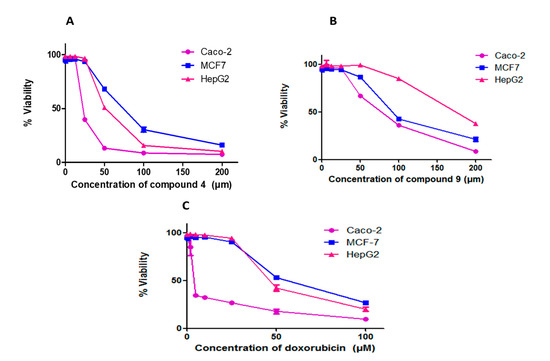 Compounds 4 and 9 and doxorubicin inhibit proliferation in different cancer cell lines. Cells were treated with various concentrations of each compound for 48 h and cell viability was plotted against drug concentration to calculate IC50. The IC50 values of each drug are expressed as mean ± SE of three independent experiments performed in triplets calculated and plotted using Graphpad Prism software 6 (San Diego, CA).