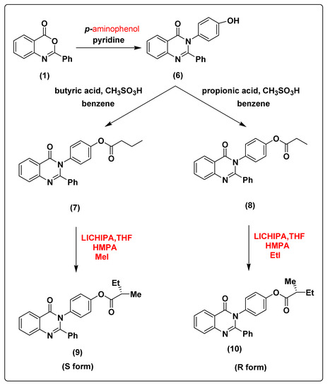 The treatment of compound 1 with p-amino phenol leads to the formation of 3-(4-hydroxyphenyl)-2-phenylquinazolin-4(3H)-one (6) with 91% yield. The chemical modification of compound 6 with butyric acid and propionic acid in the presence of methanesulfonic acid and benzene as solvent under reflux conditions using dean stark trap leads to the formation of 4-(4-oxo-2-phenylquinazolin-3(4H)-yl)phenyl butyrate (7) and 4-(4-oxo-2-phenylquinazolin-3(4H)-yl)phenyl propionate (8) with 89% and 88% yield, respectively. The deprotonation of compound 7 using lithium cyclohexylisopropylamine (LICHIPA) at −96 °C followed by alkylation using methyl iodide in the presence of tetramethylethylenediamine (TMEDA) as catalyst lead to formation of (S)-4-(4-oxo-2-phenylquinazolin-3(4H)-yl)phenyl 2-methylbutanoate (9) with 90% yield. While the alkylation of compound 8 lead to the formation of (R)-4-(4-oxo-2-phenylquinazolin-3(4H)-yl)phenyl 2-methylbutanoate (10) with 90% yield (the change of the configuration occur according to the principle of order of addition, as represented in Scheme 2. The structures of compounds 6, 7, 8, 9 and 10 were characterized via NMR spectroscopy, FT-IR and elemental analysis as shown in Supplementary Materials.