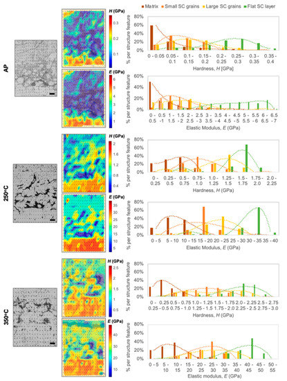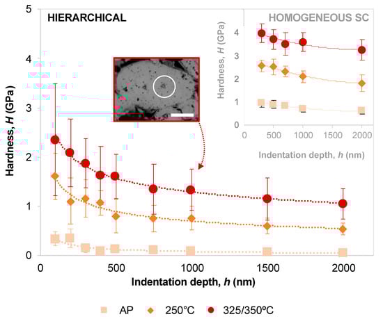 Figure 2 shows how the measured hardness changes with indentation depth in the hierarchical materials, heat-treated at different temperatures. A comparison with the homogeneous SC nanocomposites is also shown. A representative micrograph of the indents’ size with respect to SC grain size is also shown for the material HT at 350 °C, for which an optimal indentation depth of 1 µm was selected, while 750 nm was chosen for AP and HT 250 °C materials.