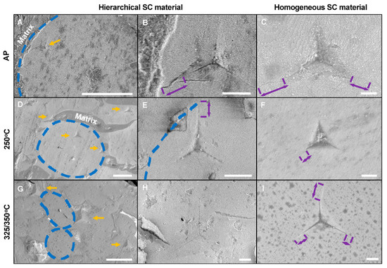 Indents in hierarchical and homogeneous SC materials processed at increasing temperatures. (A–C), AP; (D–F), 250 °C; (G–I), 350 °C. (A,D,G) show indents in the SC grains of the hierarchical nanocomposites, while (B,E,H) show analogous indents at higher magnifications. Grain boundaries are highlighted with dashed lines, indents are marked with arrows. Very few cracks are observed in the hierarchical nanocomposites, but defects emerge in the 350 °C case. (C,F,I) show indents in the homogeneous SC materials at increasing temperature (AP, 250 °C, 325 °C) from top to bottom. Cracks at indents’ corners are here visible and their lengths are marked. Scale bars are 10 µm in (A,D,G), 2 µm otherwise.