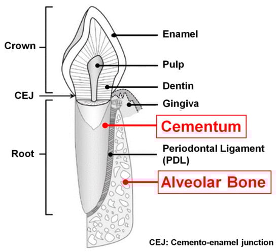 - Yamamoto, T.; Hasegawa, T.; Yamamoto, T.; Hongo, H.; Amizuka, N. Histology of human cementum: Its structure, function, and development. Jpn. Dent. Sci. Rev. 2016, 52, 63–74. [Google Scholar] [CrossRef] [PubMed]