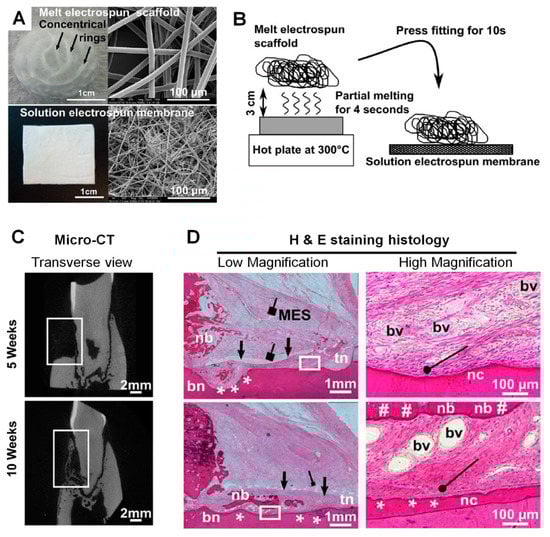 - Yu, Y.; Hua, S.; Yang, M.; Fu, Z.; Teng, S.; Niu, K.; Zhao, Q.; Yi, C. Fabrication and characterization of electrospinning/3D printing bone tissue engineering scaffold. RSC Adv. 2016, 6, 110557–110565. [Google Scholar] [CrossRef]
