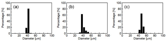 Number-weighted droplet diameter distributions of O/W emulsions obtained by MC emulsification using (a) MC-A, (b) MC plate type B (MC-B), and (c) MC plate type C (MC-C) (see Section 3.2). SC concentration was 3 wt%, and emulsification temperature was 60 °C. Each histogram contains data on diameter for more than 100 droplets.