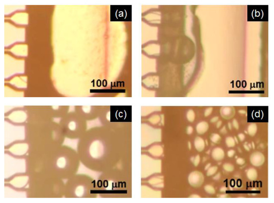 Droplet generation by microchannel (MC) emulsification at 60 °C with MC-A using (a) 0.1, (b) 0.5, (c) 1.0, and (d) 3.0 wt% SC as an emulsifier.