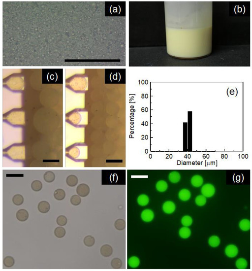 - Ikkai, F.; Iwamoto, S.; Adachi, E.; Nakajima, M. New method of producing mono-sized polymer gel particles using microchannel emulsification and UV irradiation. Colloid Polym. Sci. 2005, 283, 1149–1153. [Google Scholar] [CrossRef]