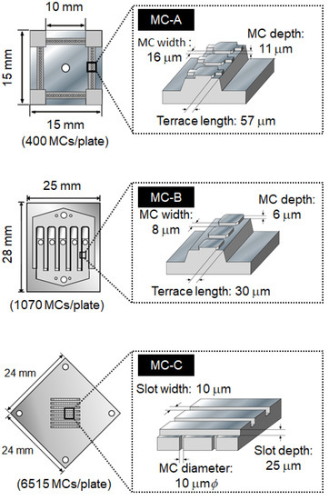 O/W emulsions were prepared by MC emulsification using a laboratory-scale MC emulsification setup with grooved [24,25] or asymmetric straight-through [46] silicon MC plates (Figure 9). Two different grooved MC plates (dead-end type: MC-A, and cross-flow type: MC-B) were used in this study. The dimensions of the MCs (MC depth, MC width, and terrace length for grooved MC [44]; MC diameter, slit width, and slit depth for asymmetric straight-through MC [44]) fabricated on each silicon plate are also illustrated in Figure 9. The MC emulsification setup and silicon MC plates were purchased from EP-Tech (Hitachi, Japan).