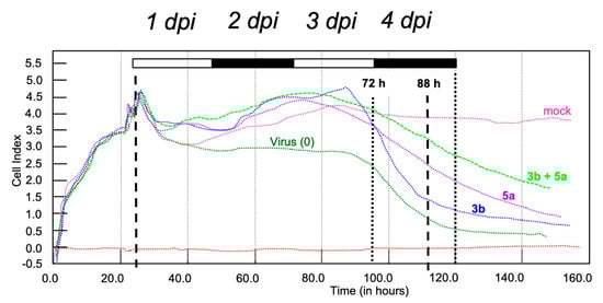 In our assay, cells showed an increase in impedance up to a cell index (CI) of 3.5 in the first 24 h after plating, representing increasing cell–cell contacts and adherence to the well bottom. At this point, the medium was removed (spike; first dotted line in Figure 3) and antiviral compounds were added for a 30-min pretreatment, then ZIKV was added. At the end of the first day of infection (1 day postinfection (dpi)), CI varied, with CI values higher than mock in the combination (light green) and with 5a alone. Virus without compounds (dark green) showed a beginning of loss of impedance, reflecting ZIKV cytopathological effect of cells rounding, with loss of adherence and loss of electrical resistance (impedance). Up to 2 days of infection, the CI values increased, except in the virus control, whereas at 3 dpi (72 h), a significant separation of impedance was observed: the combination curve is similar to the CI value of the uninfected control (mock), indicating full protection. The wells treated with single compounds show less protection with lower CI values. CI value for uninfected cells (mock) remains at the same level until the end of the experiment. All other CI values drop up to 88/96 h postinfection, when the dropping of CI value for the virus only control flattens out, but does not reach a plateau. Relative efficacy of compounds can be determined at any point between 72 and 96 h postinfection. From 72 h postinfection, the effect of the combination of 3b and 5a was more effective than the individual compounds. With the known mechanism of action of the active form of 3b being viral polymerase inhibition, and the mechanism of action of 5a being most likely interference with a host pathway, and with early data found in our lab indicating autophagy inhibition (unpublished results), the observed increased efficacy suggesting synergy. In addition, the calculated EC50 of the 1:1 combination of 3b and 5a in HUH7 cells is 1 ± 0.2 μM, supporting the effects observed on cell impedance/cell-adherence using thexCELLigence RTCA DP instrument.