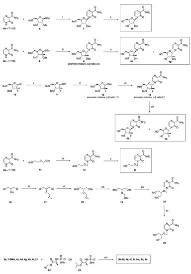 Due to the anti-ZIKV activity previously found for 2′-CMA (3a) and 7-DMA [21,22], we prepared a small family of novel aryloxyphosphoramidate prodrugs of these two nucleosides (3b–3d) to evaluate the effect of the application of this prodrug technology [23] on the activity of the parent compounds. In addition, we prepared a series of nucleoside analogues (4b–4o) of the broad-spectrum antiviral agent T-1105 (4a), which has also been reported to inhibit ZIKV replication in cell-based assays, along with its close analogue T-705 (favipiravir), approved in Japan to treat influenza virus infections [24]. As T-1105 and T-705 exert their antiviral activity by inhibiting the viral polymerase after metabolic conversion into their ribofuranosyl 5′-triphosphate forms [24], a small series of ribofuranose analogues of T-1105 and their aryloxyphosphoramidate prodrugs was designed (4c–4i) to modify the sugar part of the nucleoside with the insertion of a 2′-C-methyl substituent, as present in 2′-CMA and 7-DMA, and to introduce the same replacement of the 2′-hydroxy group with a fluorine atom, as present in sofosbuvir. Since the corresponding α-anomers of nucleosides 4c and 4d were obtained during their synthetic preparation (4g, 4h), these were also included in our assays, along with one aryloxyphosphoramidate prodrug of 4h (4i), and the unmodified ribofuranosyl analogue 4b. Finally, as our group is also exploring the antiviral potential of acyclic analogues of T-1105 (unpublished data), acyclic compound 4l was also considered, along with acyclic aryloxyphosphoramidate prodrugs 4m, 4n, and 4o.