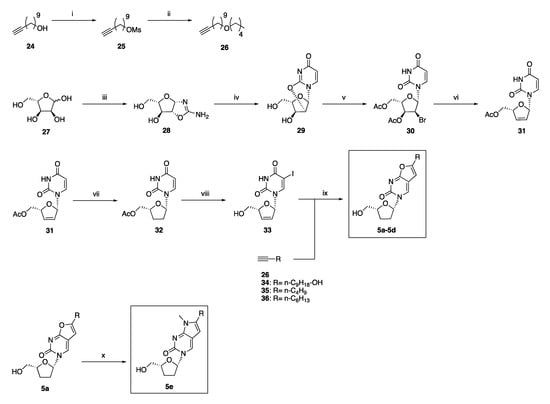 Preparation of 5a and 5d has been previously described [25], and the reported method was followed also to obtain 5b and 5c. Briefly, commercial carbohydrate 27 was reacted with cyanamide to afford the bicyclic oxazoline 28, which was treated with methyl propiolate in methanol to provide the 2,2′-anhydro-nucleoside 29. Following a bromoacetylation reaction with acetyl bromide in acetonitrile, 29 was converted into nucleoside 30, which was subjected to a reductive β-elimination with activated zinc powder in the presence of glacial acetic acid, to afford 5′-O-acetyl-2′,3′-didehydro-2′,3′-dideoxyuridine 31. The dideoxy nucleoside 32 was then obtained upon catalytic hydrogenation of 31, while preparation of L-5-iodo-2′,3′-dideoxyuridine 33 was achieved after iodination at the C5-position of the nucleobase with iodine in the presence of ammonium cerium(IV) nitrate (CAN), followed by deacetylation with sodium methoxide. A palladium-catalysed Sonogashira coupling of 33 with acetylenes 26 and 34–36 provided the corresponding 5-alkynyl nucleosides, which, after addition of copper (I) iodide in situ with heating, afforded the desired furanopyrimidine products 5a–d, following an intramolecular cyclisation. While 34–36 are commercially available, 26 was prepared in two steps as previously described [29], starting from undec-10-yn-1-ol 24. Preparation of the N-methyl-pyrrolo-pyrimidin-2-one analogue 5e has also been previously described [36], and was obtained from 5a, which was treated with methylamine in methanol while heating, in order to achieve the opening of the fused furane ring by the amine. This was then followed by refluxing the reaction in a higher-boiling solvent mixture after treatment with p-TsCl, to promote a dehydration and cyclisation of the system, with the formation of the target pyrro analogue 5e.