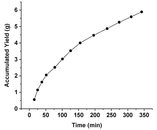 In the present study, to obtain the overall extraction curve, a temperature and pressure of 100 bar and 40 °C were used, respectively, with the objective of guaranteeing the worst extraction scenario (under mild extraction conditions), a sample of 7.5 g propolis and 6 g/min CO2 flow rate [33,49]. The experiment was performed as follows: the extracts were collected at predetermined periods in vials of previously known weight. The S/F value was calculated according to Equation (1).