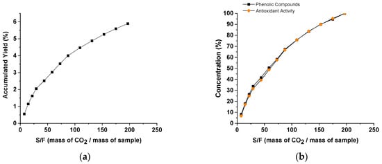 Results obtained for the overall extraction curves for (a) yield in mass (g) of accumulated extract versus S/F and (b) yield of phenolic compounds (%) and antioxidant activity (%) versus S/F (mass of CO2/mass of sample) (cumulative values).