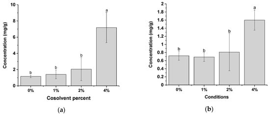 Determination of the levels of (a) Formononetin (mg/g); and (b) Kaempferol (mg/g) by HPLC-DAD in the extracts of red propolis obtained with the presence of different cosolvent percentages and using CO2 as a supercritical fluid (50 °C; 250 bar; CO2 flow rate of 6 g/min; S/F 131). Bars with the same letter are not significantly different (p < 0.05) according to Tukey’s test at the 95% confidence level.
