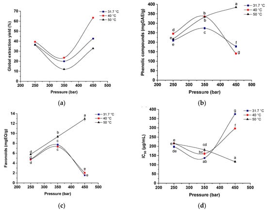 Regarding yield, a higher extraction percentage (63.46%) was obtained at a pressure of 450 bar at 40 °C, while the highest content of phenolic compounds (380 mgEAG/g) and flavonoids (10 mg EQ/g) and higher antioxidant capacity (110 μg/mL) were obtained under 450 bar and 50 °C. Figure 4a shows that at constant pressures of 350 and 450 bar the increase in temperature significantly favors the extraction capacity, and consequently, the global yield of the process.