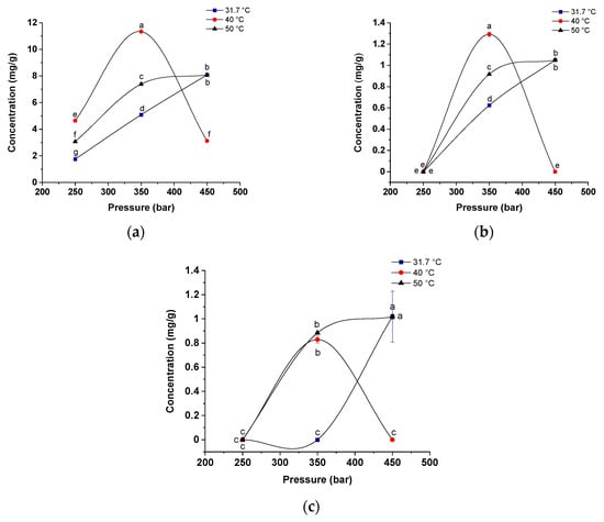 Isotherms for the concentration of: (a) formononetin; (b) naringenin; and (c) kaempferol for the extraction of red propolis using CO2 as the supercritical fluid, ethanol as the cosolvent (4%, w/w) at temperatures of 31.7, 40 and 50 °C and pressures of 250, 350 and 450 bar (CO2 flow rate of 6 g/min and S/F 131). Values that show the same letter in the same graph are not significantly different (p < 0.05) by the Tukey test at a confidence level of 95%.