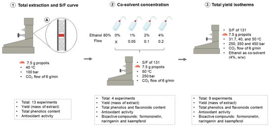 Illustrative summary of the steps, parameters used, total experiments and analyses performed at each step of the present study to obtain red propolis extract with high antioxidant capacity by SFE. 1—First step: determination of the overall extraction curve and S/F (mass of CO2/mass of sample); 2—Second step: influence of the cosolvent percentage; 3—Third step: determination of the global yield isotherms. In A, the packing of the extraction bed to avoid the formation of preferential CO2 paths is shown.