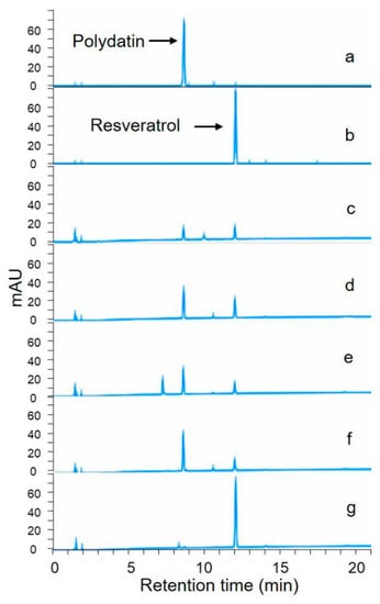 Representative high-performance liquid chromatography (HPLC) chromatogram of biotransformation activity screening of positive strains. (a): polydatin standard; (b): resveratrol standard; (c): Z1; (d): Z3; (e): Z4; (f): Z5; (g): X1.