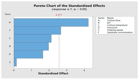 The effects of six parameters including culture time, initial pH, inoculation rate, culture temperature, shaking speed and substrate concentration were investigated using the Plackett–Burman (PB) test [37]. In the test, n was set as 12, every factor was set as two levels. Minitab 17 (Minitab Inc, State College, PA, USA) software was applied to evaluate the effects and significance of each factor, in order to confirm the significance factor. Factor levels of the PB test design are shown in Table 8.