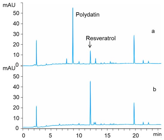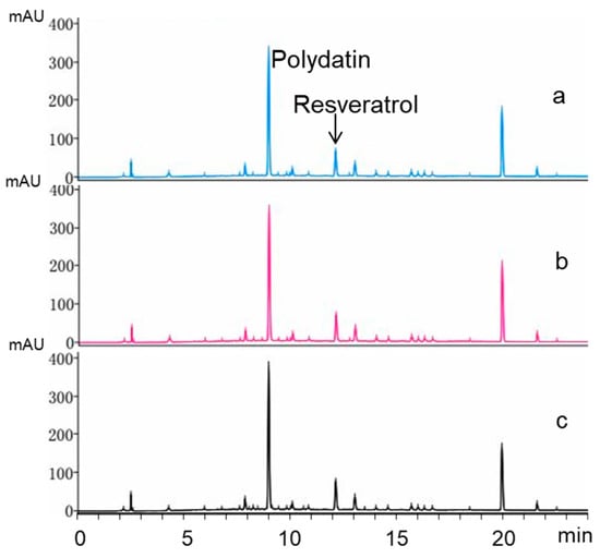 Representative HPLC chromatogram of X1 culture transforming polydatin in crude extract into resveratrol. (a): RJE (10 mg/mL); (b): RJE (10 mg/mL) + 5% seed culture; (c): RJE (10 mg/mL) + X1 culture that grows to a logarithmic stage.