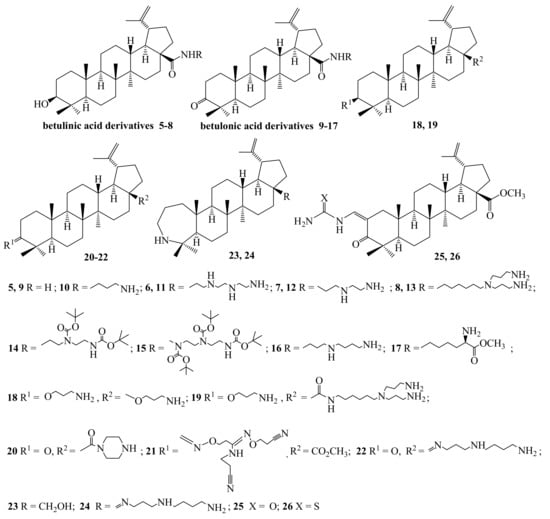 - Giniyatullina, G.V.; Kazakova, O.B.; Medvedeva, N.I.; Sorokina, I.V.; Zhukova, N.A.; Tolstikova, T.G.; Tolstikov, G.A. Synthesis of aminopropylamino derivatives of betulinic and oleanolic acids. Russ. J. Bioog. Chem. 2013, 39, 329–337. [Google Scholar] [CrossRef]
