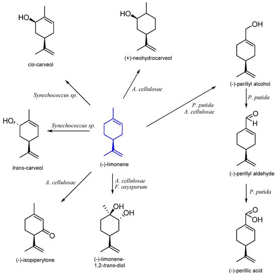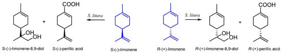 - Molina, G.; Bution, M.L.; Bicas, J.L.; Dolder, M.A.H.; Pastore, G.M. Comparative study of the bioconversion process using R-(+)- and S-(–)-limonene as substrates for Fusarium oxysporum 152B. Food Chem. 2015, 174, 606–613. [Google Scholar] [CrossRef]