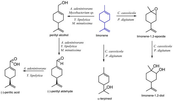 | Colletotrichum nymphaeae CBMAI 0864 Rhodococcus erythropolis Grosmannia claviger | limonene-1,2-epoxide limonene-1,2-diol | [31] | |