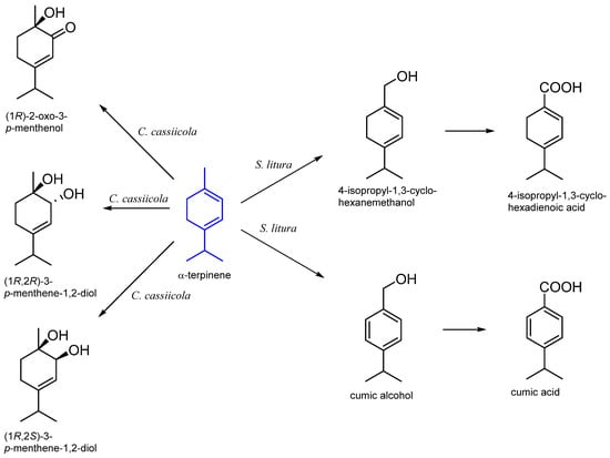 | Corynespora cassiicola DSM 62475 | 3-p-menthene-l,2-diol 2-oxo-3-p-menthenol 3-p-menthene-1,2-diol | [42,43] |