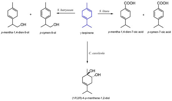 - Krings, U.; Brauer, B.; Kaspera, R.; Berger, R.G. Biotransformation of g-terpinene using Stemphylium botryosum (Wallroth) yields p-mentha-1,4-dien-9-ol, a novel odorous Monoterpenol. Biocatal. Biotransform. 2005, 23, 457–463. [Google Scholar] [CrossRef]
