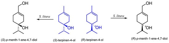 - Miyazawa, M.; Kumagae, S. Biotransformation of (R)-and (S)-terpinen-4-ol by the larvae of common cutworm (Spodoptera litura). J. Agric. Food Chem. 2001, 49, 4312–4314. [Google Scholar] [CrossRef]