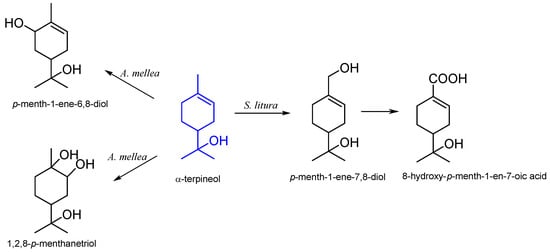 - Molina, G.; Pessôa, M.G.; Bicas, J.L.; Fontanille, P.; Larroche, C.; Pastore, G.M. Optimization of limonene biotransformation for the production of bulk amounts of α-terpineol. Bioresour. Technol. 2019, 294, 122180. [Google Scholar] [CrossRef]