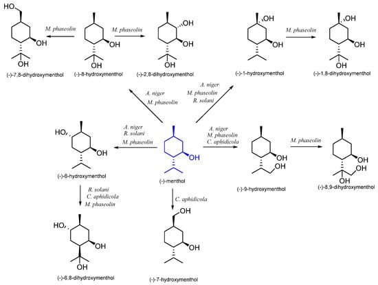 | Cephalosporium aphidicola | (−)-6-hydroxymenthol (−)-7-hydroxymenthol (−)-8-hydroxymenthol (−)-9-hydroxymenthol | [52] | |