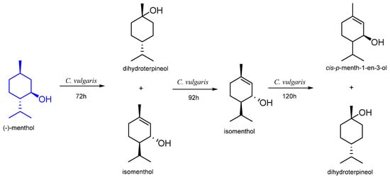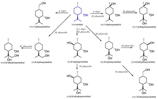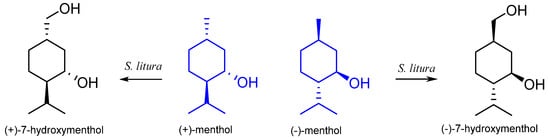 - Musharraf, S.G.; Ahmed, M.A.; Ali, R.A.; Choudhary, M.I. Hydroxylation of (+)-menthol by Macrophomina phaseolina. Biocatal. Biotransform. 2011, 29, 77–82. [Google Scholar] [CrossRef]