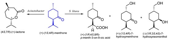 | (1S,4R)-(+)- | Acinetobacter NCIEI 9871Acinetobacter TD63 | (4S,7R)-(+)-mentholactone | [57] |