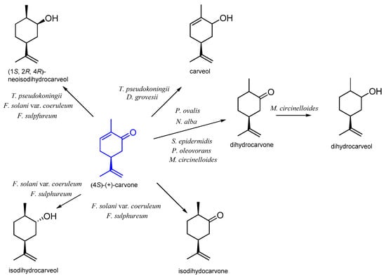 | (R)-(−) | Mucor circinelloides | dihydrocarvone dihydrocarveol p-menthane-2,8,9-triol | [68] |