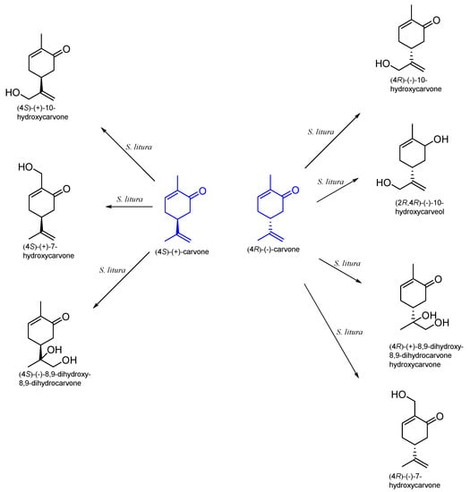 - Marumoto, S.; Okuno, Y.; Hagiwara, Y.; Miyazawa, M. Biotransformation of (+)-Carvone and (-)-Carvone by the Common Cutworm Spodoptera litura Larvae. J. Oleo Sci. 2018, 67, 1253–1257. [Google Scholar] [CrossRef]