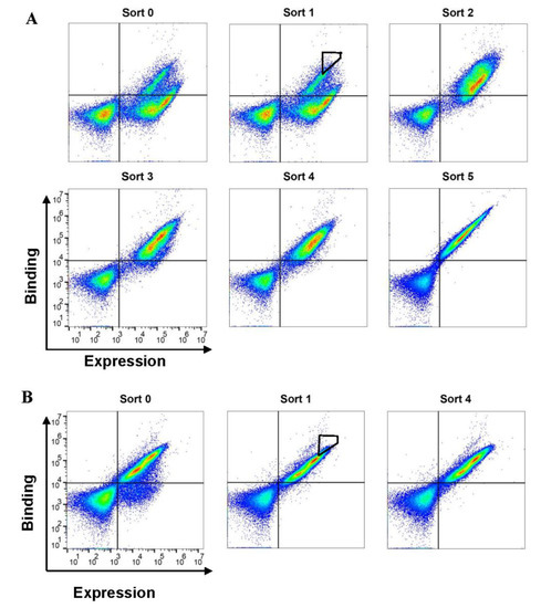 - Colby, D.W.; Kellogg, B.A.; Graff, C.P.; Yeung, Y.A.; Swers, J.S.; Wittrup, K.D. Engineering antibody affinity by yeast surface display. Methods Enzymol. 2004, 388, 348–358. [Google Scholar]