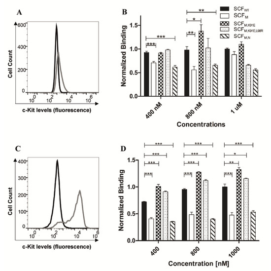 Improved and reduced binding of SCF variants to cell-surface c-Kit. (A) Expression levels of c-Kit in the A172 cell line. Grey and black lines represent c-Kit expression and background signals, respectively. (B) Binding of SCF variants to A172 cells expressing c-Kit. (C) Expression levels of c-Kit in murine HSPCs. (D) Binding of SCF variants to HSPCs. In panels (B,D) the columns are designated as follows: SCFWT (black columns), SCFM (white columns) and SCFM,K91E (checkered columns), SCFM,K91E,L98R (dotted columns) and SCFM,S64P,F126S,V131A,E134G,V139I (cross-hatched columns). The results were normalized to SCFWT binding at the highest concentration of 1000 nM. Values are means ± SEM of independent measurements performed in triplicate. * p < 0.05; ** p < 0.01; *** p < 0.001.