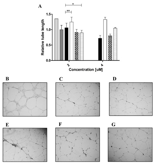 SCF variants with different functional effects on primary human umbilical vein endothelial cells (HUVECs). (A) HUVECs with 2% fetal bovine serum (FBS) as the positive control (light gray column), untreated HUVECs as negative control (dark gray column), and cells treated with 4 µM of SCFWT (black columns), SCFM (white columns), SCFM,K91E (checkered columns) and SCFM,K91E,L98R (dotted columns). Tube length was normalized to untreated cells, which served as a control. Values are means ± SEM of independent measurements performed in triplicate. (B) Positive control. (C) Negative control. (D) SCFWT. (E) SCFM. (F) SCFM,K91E. (G) SCFM,K91E,L98R. In panels (B–G) all proteins were added at a concentration of 4 µM. * p < 0.05; ** p < 0.01.