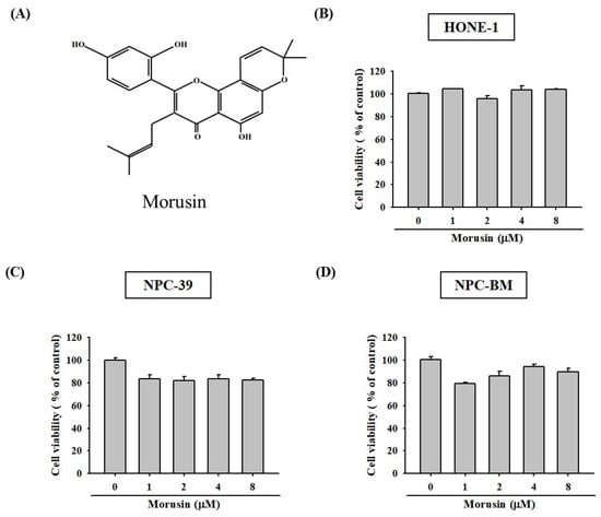 Effect of morusin on cell viability in human NPC cells. (A) The chemical structure of morusin. (B) HONE-1; (C) NPC-39; and (D) NPC-BM cells were treated with various concentrations (0–8 μM) of morusin for 24 h and then examined for cell viability. The data are presented as mean ± SD from at least triplicates independent experiments.