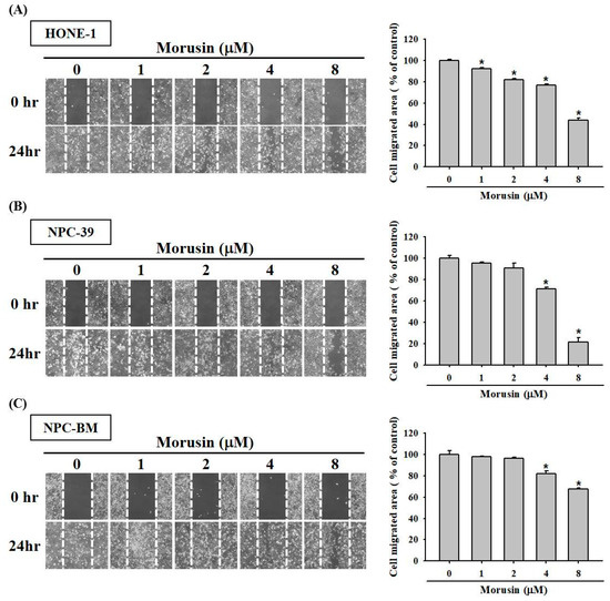 Effect of morusin on cell wound closure in human NPC cells. Wound healing assay evaluated the effect of morusin on cell motility of HONE-1 (A), NPC-39 (B) and NPC-BM (C) cells lines at various concentrations by microscope (at 100× magnification). The data are presented as mean ± SD from at least triplicates independent experiments. * p < 0.05 compared with untreated.