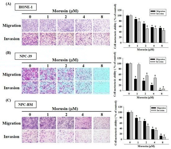 To examine the effects of morusin on the cell migration and invasion of different NPC cell lines, we used the wound-healing assay and Boyden chamber assay to investigate the cell migration and invasion abilities. In wound-healing assay for HONE-1, NPC-39, and NPC-BM cell lines, the inhibitory effects of morusin on NPC cells migration after 24 h increased as the concentrations of morusin increased (Figure 2A–C). To further evaluate the effects of morusin on the metastatic ability of NPC cells, Boyden chamber assay was performed to measure the effects on the migration (seeding cells with uncoated filter) and invasion (seeding cells with Matrigel-coated filter) activities. As shown in Figure 3A–C, at a morusin concentration of 8 μM, the migration activities for HONE-1, NPC-39, and NPC-BM cells were reduced by 45.9%, 97.8%, and 86.8%, respectively. Moreover, the inhibitory effect of morusin on NPC cell invasion increased as the concentrations of morusin increased. These results demonstrate that treatment with morusin can inhibit the migration and invasion abilities of NPC cells.