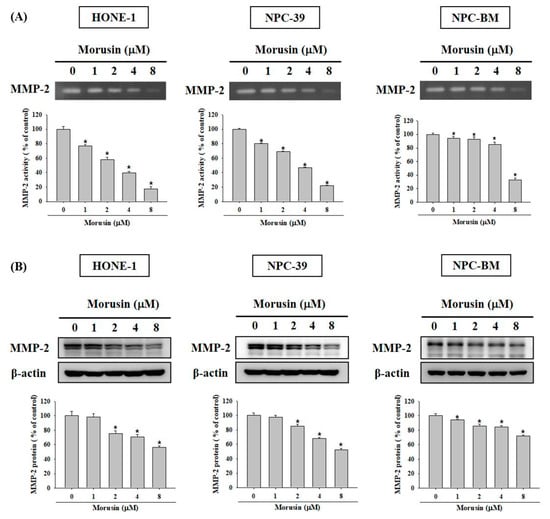Morusin inhibits the activity and expression of MMP-2 in NPC cells. HONE-1, NPC-39, and NPC-BM cells were treated with morusin (0–8 μM) for 24 h (A) Conditioned media were subjected to gelatin zymography for analyzing the activity of MMP-2. (B) Total cell lysates were prepared for determining the levels of MMP-2 protein. * p < 0.05, compared with the untreated control.